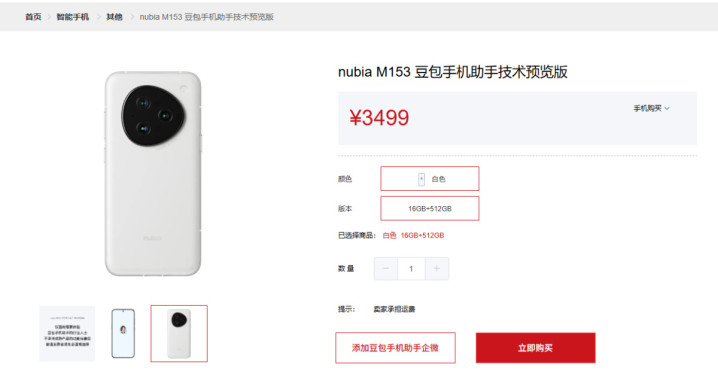 记者注意到,当前中兴商城已上线搭载豆包手机助手技术预览版的工程样机努比亚M153,该样机已少量发售。该机配备6.78英寸屏幕,搭载高通骁龙8至尊版移动平台,“16GB内存、512GB存储”的版本售价为3499元。