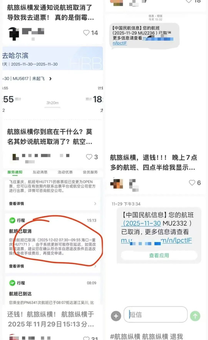 近日,多位网友反映,在11月29日下午15:00左右收到来自航旅纵横的航班取消提醒,部分用户在重新购票后才发现,实际航班并未取消,而是由于航旅纵横出现系统故障,推送了错误信息。不少用户因此额外承担了票价差价及退票手续费。